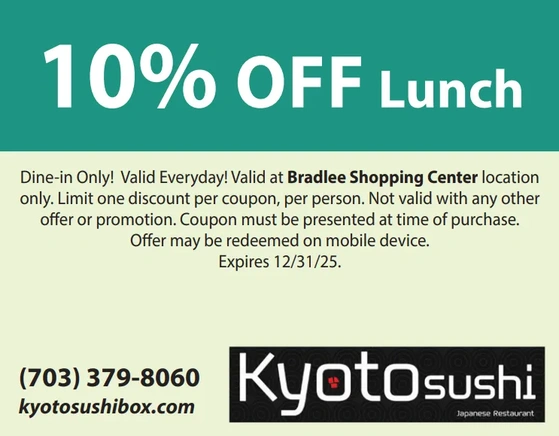 Dine-in Only! Valid Everyday! Valid at Bradlee Shopping Center location only. Limit one discount per coupon, per person. Not valid with any other offer or promotion. Coupon must be presented at time of purchase. Offer may be redeemed on mobile device. Expires 12/31/25