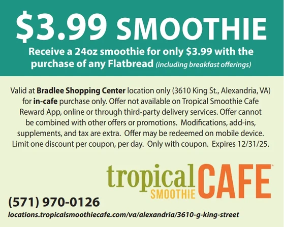 Valid at Bradlee Shopping Center location only (3610 King St., Alexandria, VA) for in-cafe purchase only. Offer not available on Tropical Smoothie Cafe Reward App, online or through third-party delivery services. Offer cannot be combined with other offers or promotions. Modifications, add-ins, supplements, and tax are extra. Offer may be redeemed on mobile device. Limit one discount per coupon, per day. Only with coupon. Expires 12/31/25.